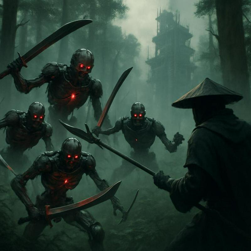 A highly detailed, dark fantasy-style scene set in a lush, dense forest with tall trees and foggy atmosphere. The scene...