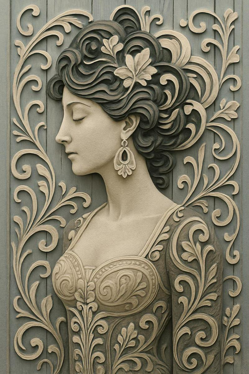 Create a highly detailed, monochromatic artwork in a style reminiscent of intricate paper cutouts or bas-relief sculptures. The central figure...
