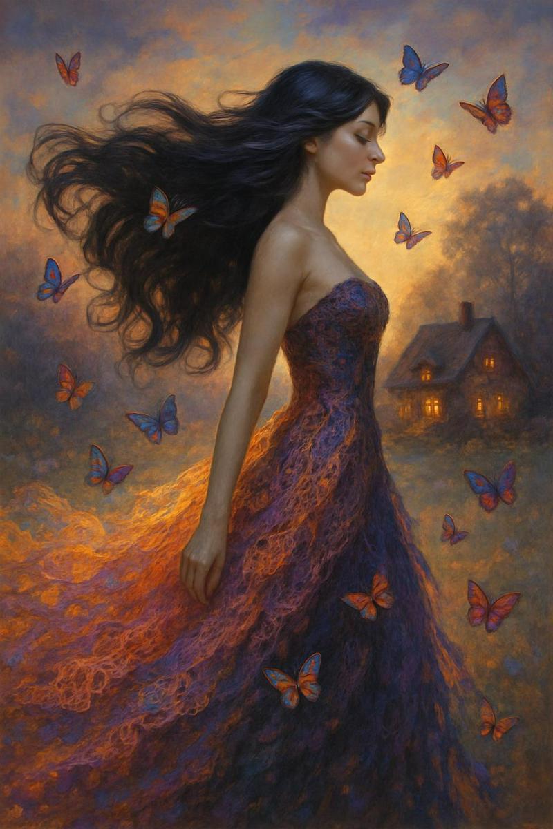A captivating woman with voluminous, dark, flowing hair, dressed in an elaborate gradient-colored gown of purples, pinks, and vibrant teals,...