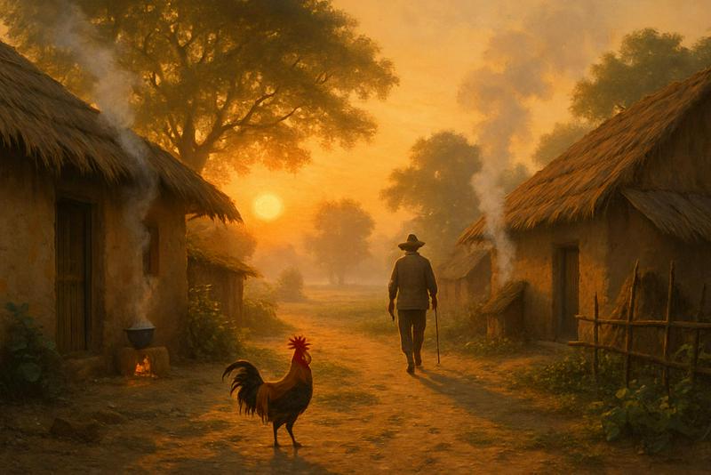 Morning light breaks over a quiet village—roosters crow, smoke rises from clay stoves, and a farmer walks toward his fields.