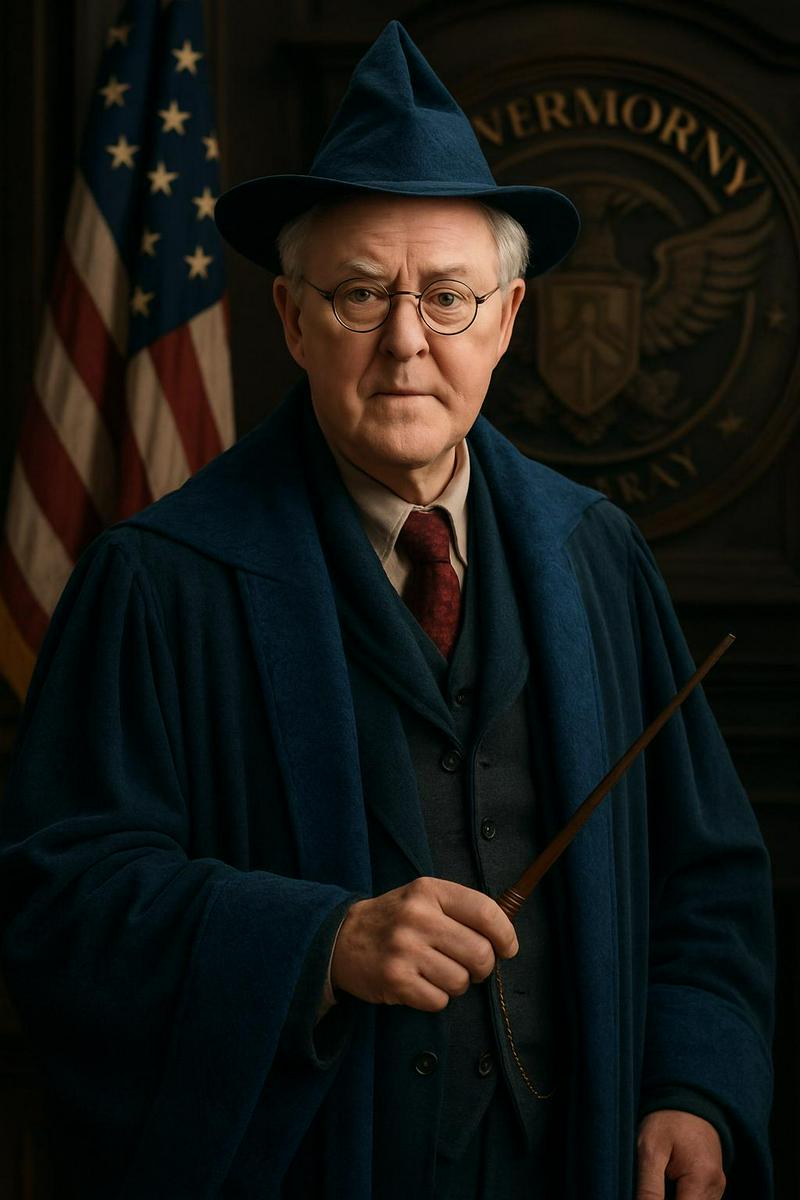 Make a image of John Lithgow as a Ilvermorny Headmaster in the Fantastic Beasts Flims