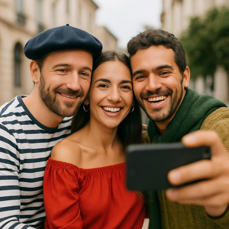 Make a image of a French Man, Spanish Woman and Portuguese Man Taking a Picture