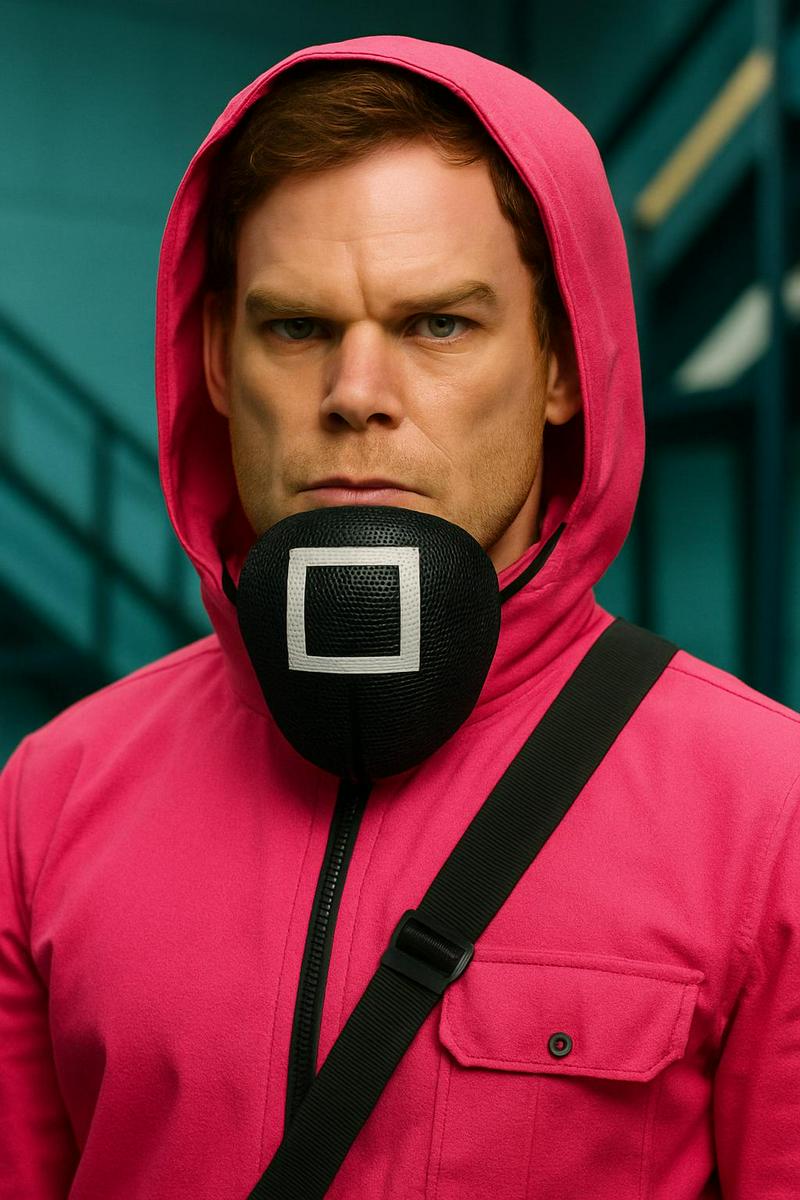 Make a image of Dexter Morgan as a Pink Guard in Squid Game