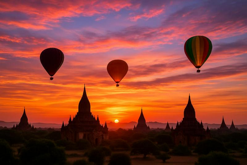 A stunning wide-angle photograph capturing the serene beauty of the Bagan plains at sunset. The sky is a breathtaking mix...