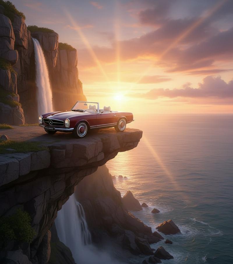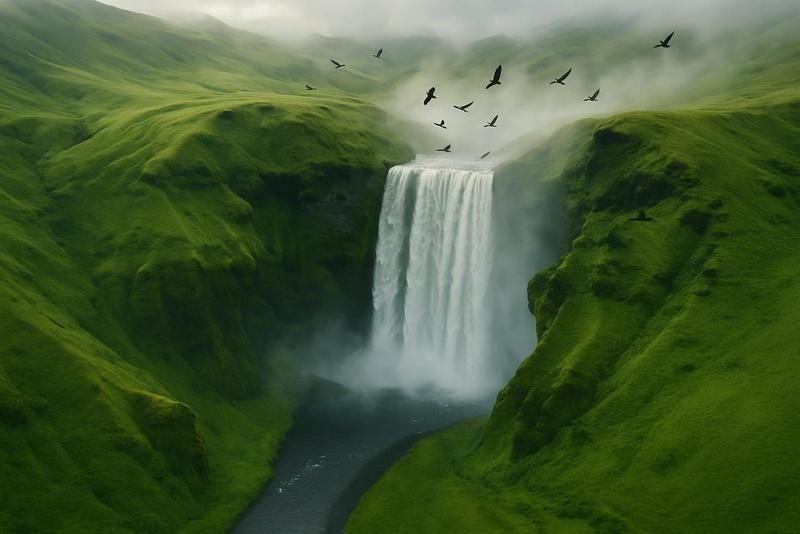 1. "Create a mesmerizing drone shot of a majestic waterfall cascading into a lush green valley, with mist rising...