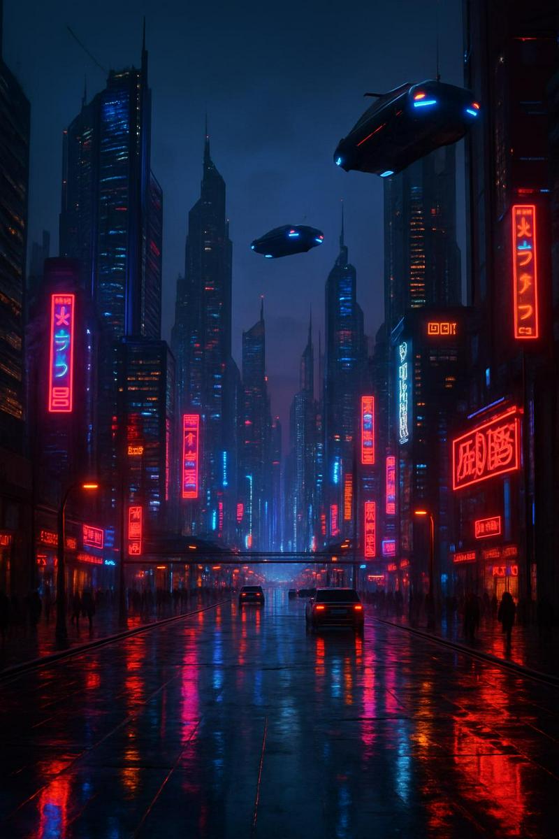 "Generate a futuristic cityscape video at dusk, with sleek skyscrapers, flying cars, and neon lights reflecting off the wet...