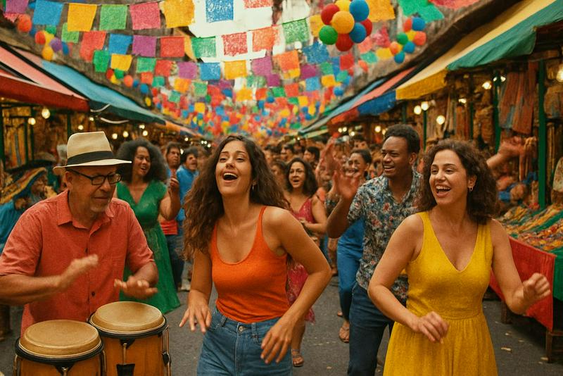 "Generate a vibrant street festival video with colorful decorations, lively music, and people dancing and celebrating in a crowded market."