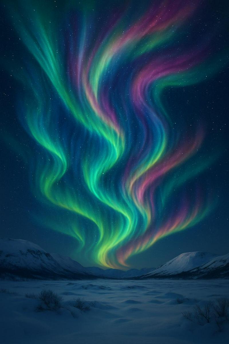 "Showcase a stunning aurora borealis display in the night sky, with vibrant colors swirling and dancing above a snowy landscape."...