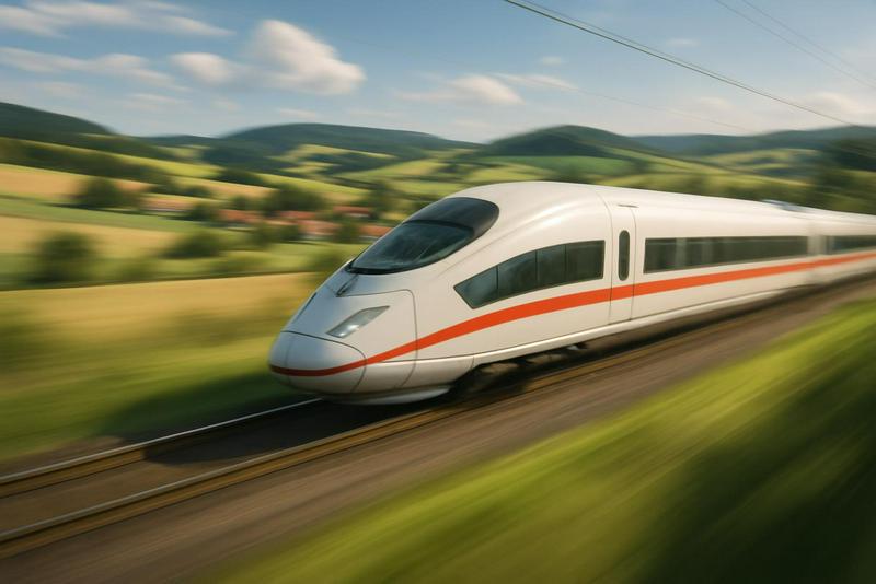 "Visualize a high-speed train traveling through a scenic countryside, with rolling hills, fields, and villages passing by in a blur."...