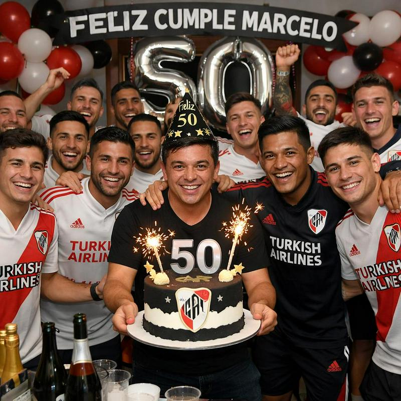Marcelo gallardo festejando sus 50 años de edad con los jugadores de river