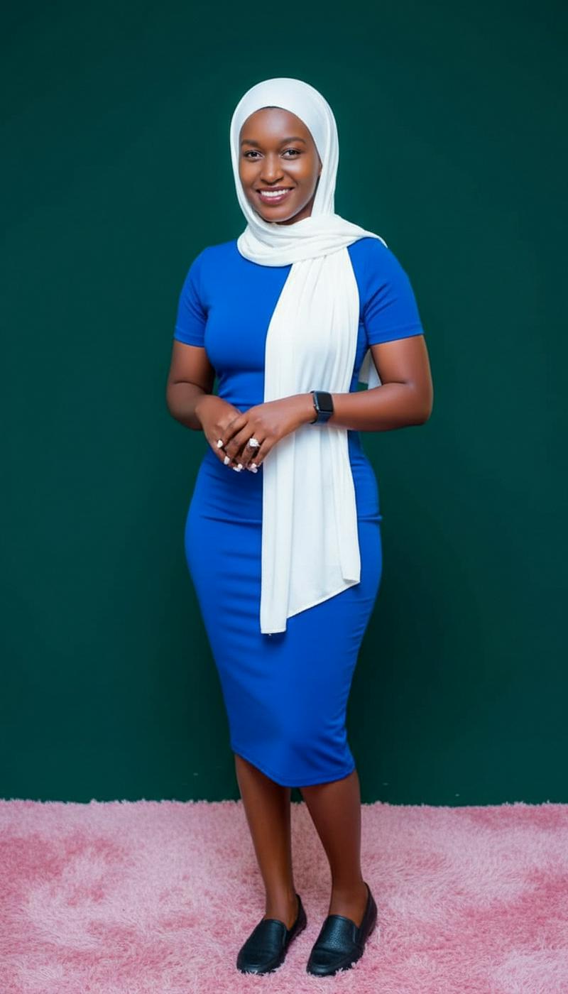 Green luxury studio back ground Light natural brown skin girl White head scarf White Neal polish Standing pose Pink carpet...