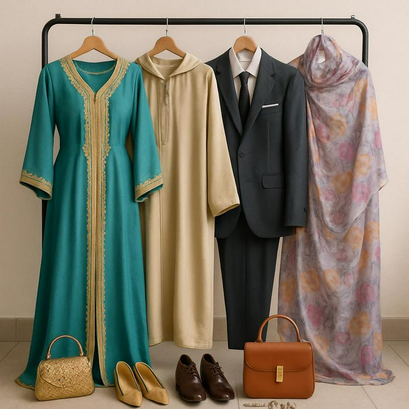 Traditional Moroccan clothes including a caftan, a men’s djellaba, a formal suit, and a Mauritanian melhfa hanging on a clothes...