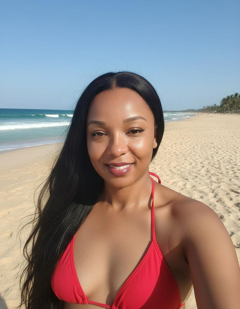 natural skin texture, freckles, subtle smile lines, unretouched appearance. change back ground to beach, long hair is preferred, a red...