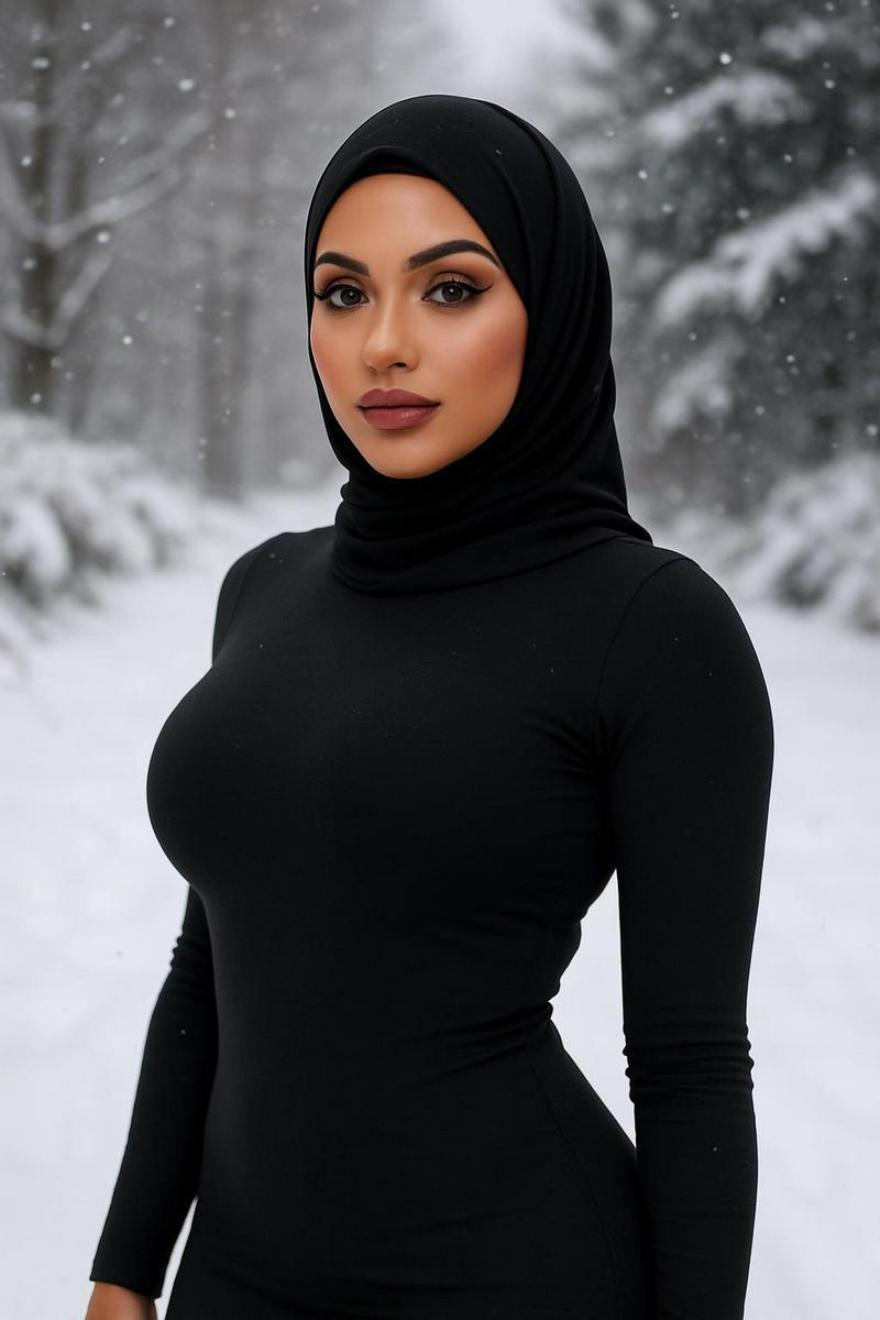 create a photo of muslim lady with a best figure , well done make up,in snow back ground